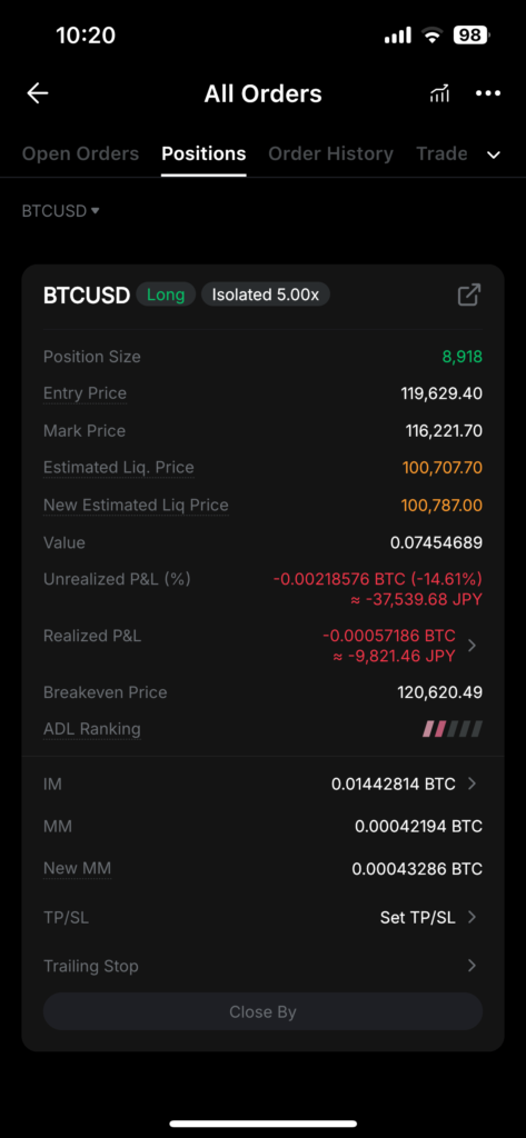 うーむ。シンプルに、購入価格×(1/Leverage)変動したらやばいと見ておけば良い気がしますね。今回はLeverageが5倍のロングなので、95,701.12 USD(-20%)にまで下がったら乙。